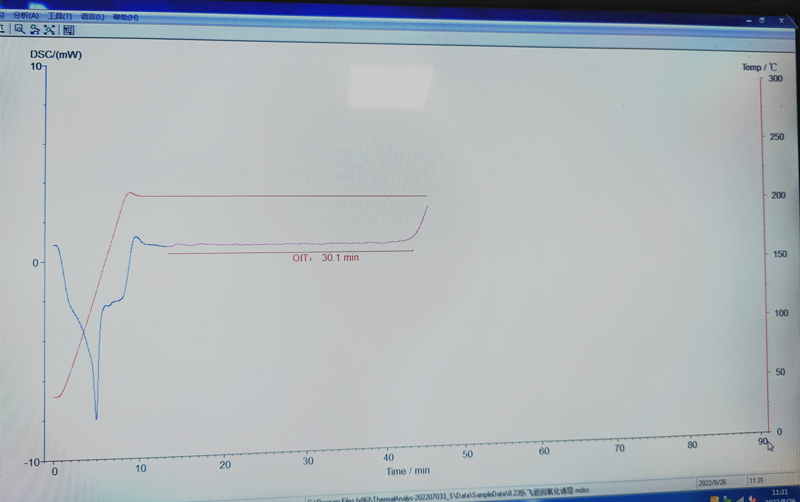 实验方法:DSC差示扫描量热法,以塑料分子链断裂时的放热反应为依据,测试塑料在高温氧气中加速老化程度的方法。