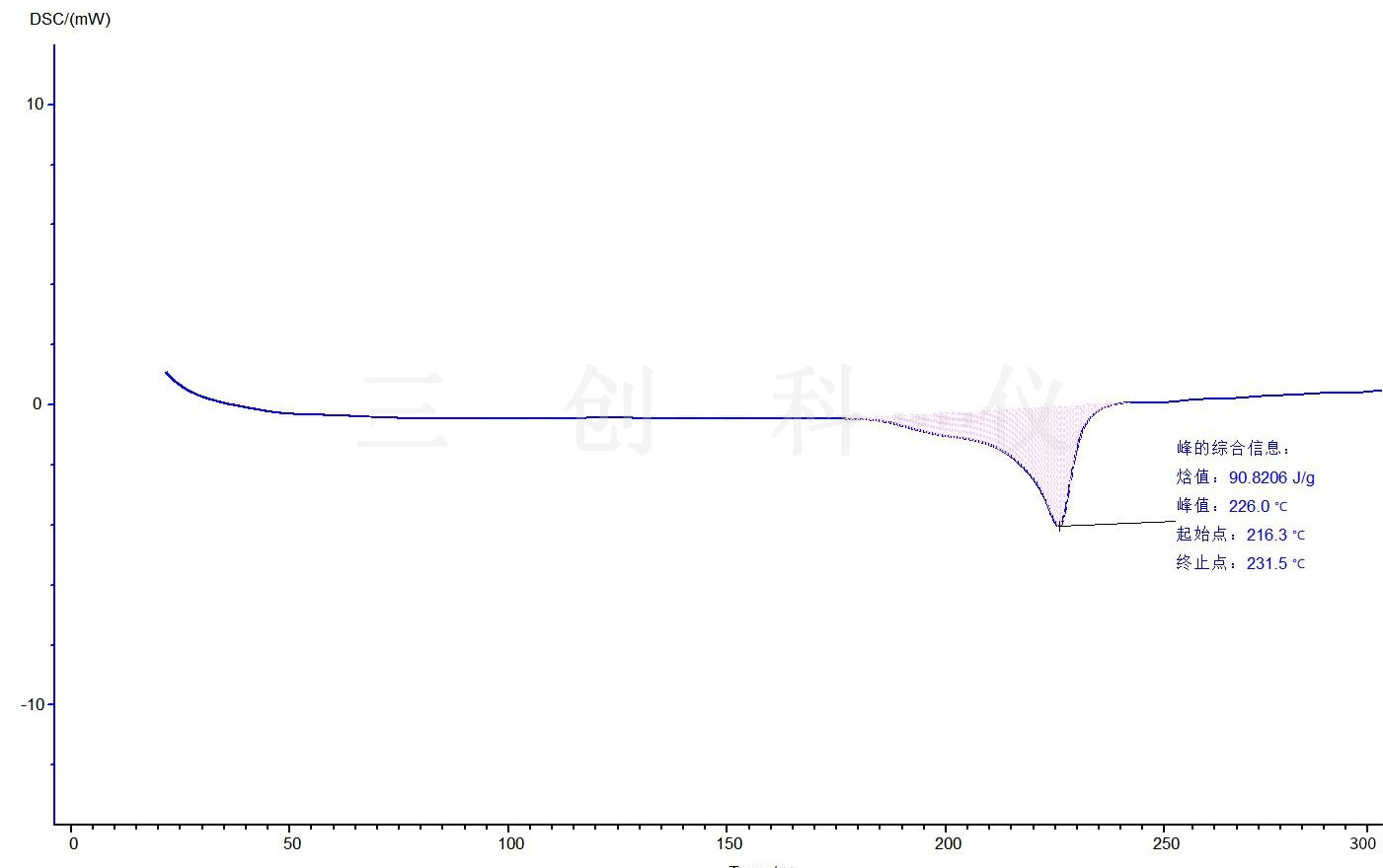 通过软件分析DSC曲线,定位吸热峰(熔融峰)。