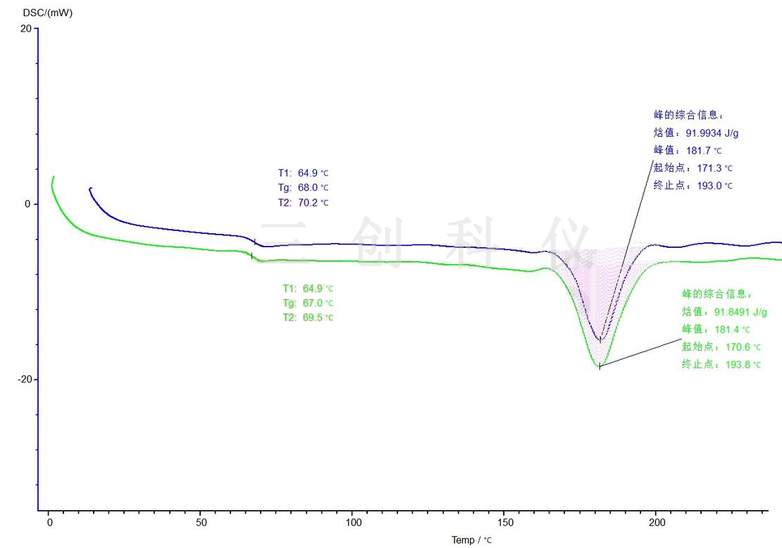 起始点:曲线基线偏离的起始点。 峰值:吸热峰的峰值温度。
