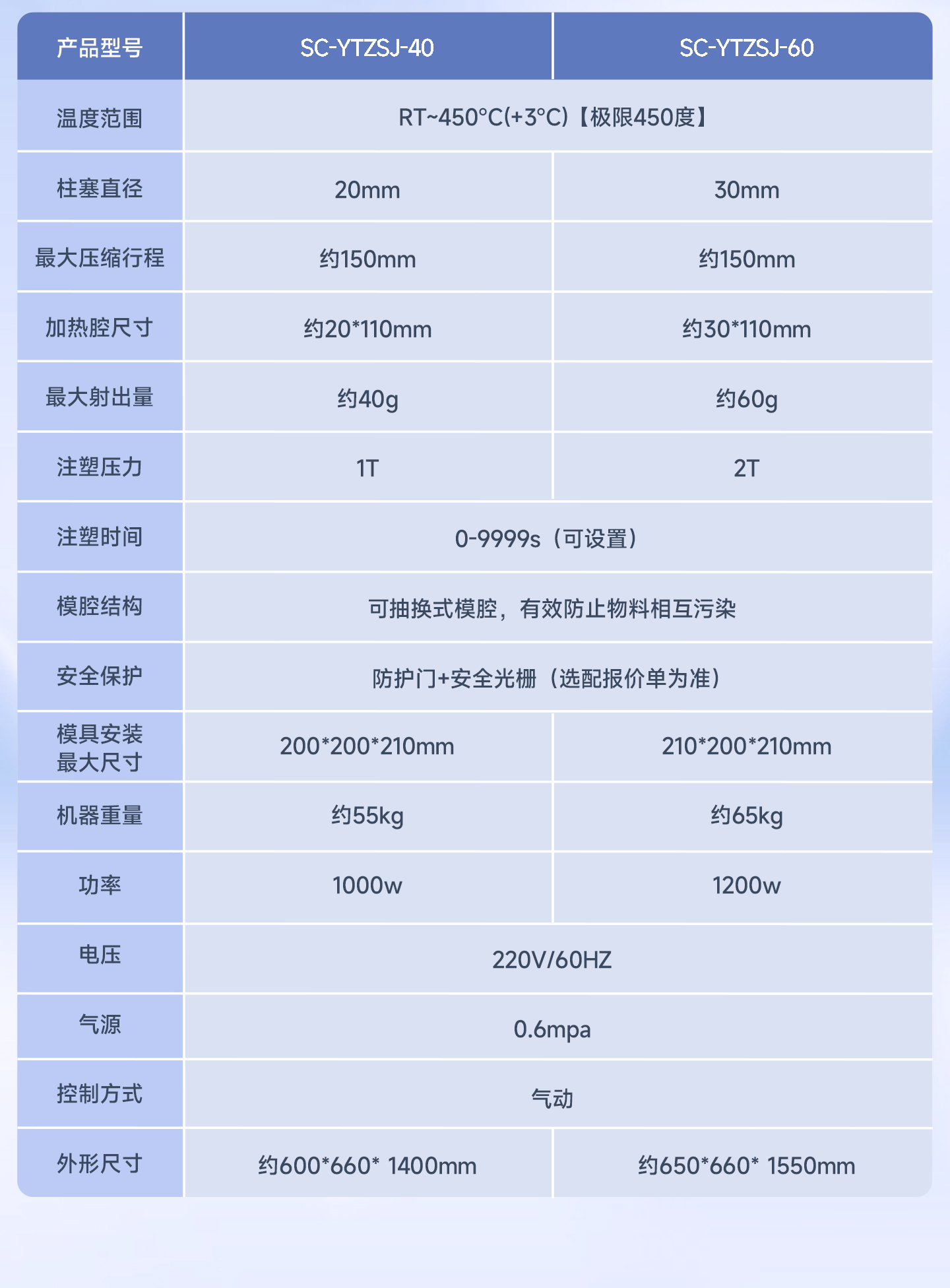 厦门市三创科仪检测设备有限公司是热分析、塑料类检测设备制造商,提供塑料橡胶整套实验室解决方案。SC-YTZUJ-40 气动小型立式注塑机产品有品牌和质量保证,三创科仪为您全方面介绍SC-YTZUJ-40 气动小型立式注塑机相关技术参数、性能特点、用途、标准、选型、作用、图片、规格型号、使用方法、计算公式、外形尺寸、工作原理、产品说明书、操作规程、安装维护及产品示意图;为广大用户提供高品质、高性能、高标准、高寿命、价格优惠的SC-YTZUJ-40 气动小型立式注塑机。